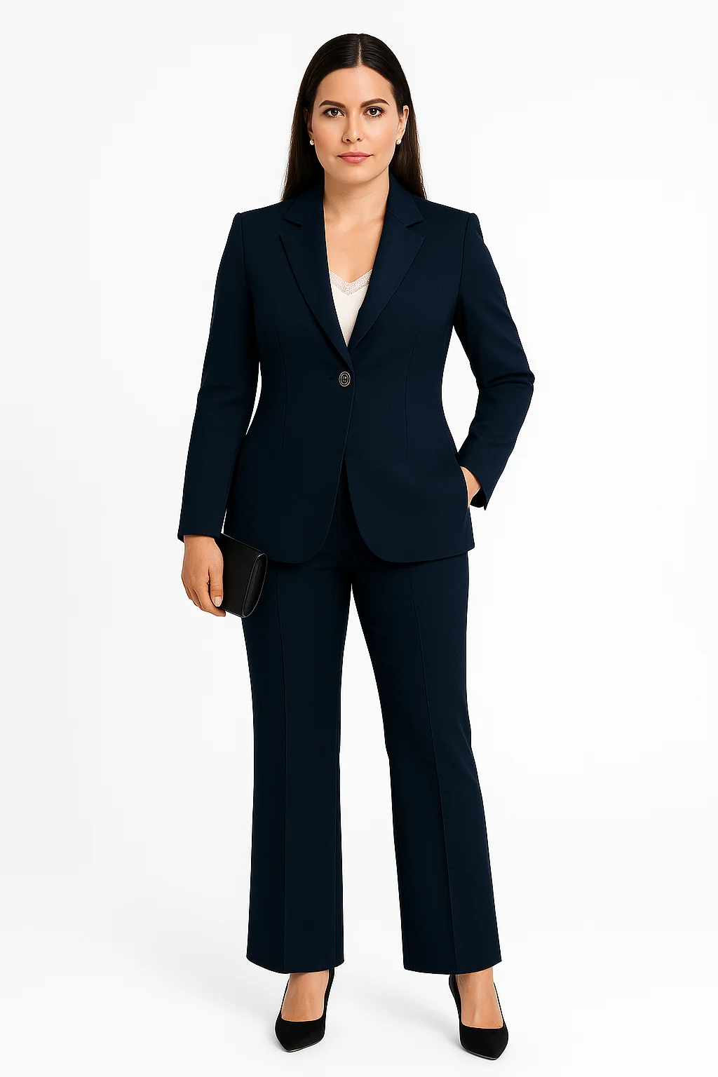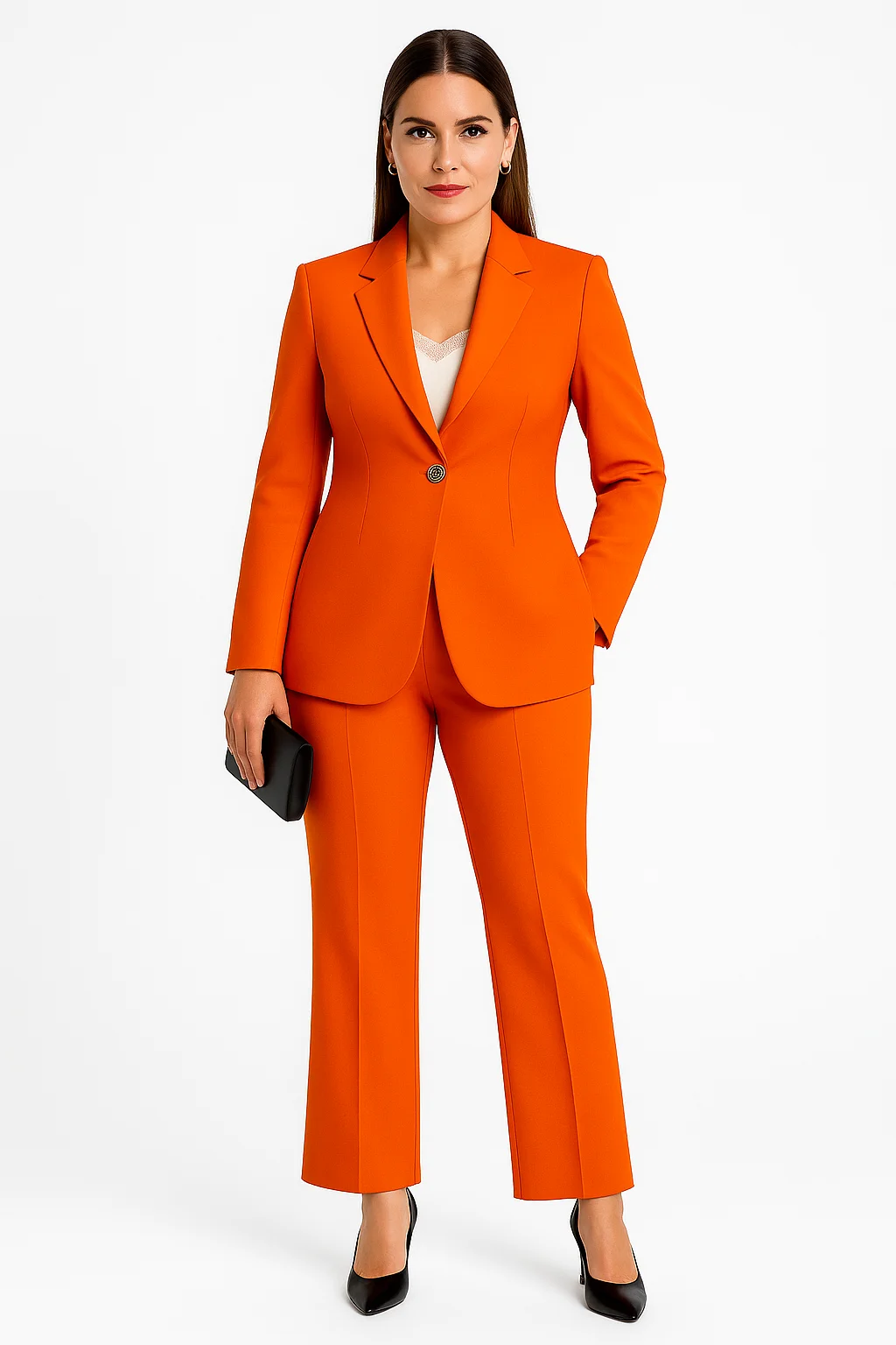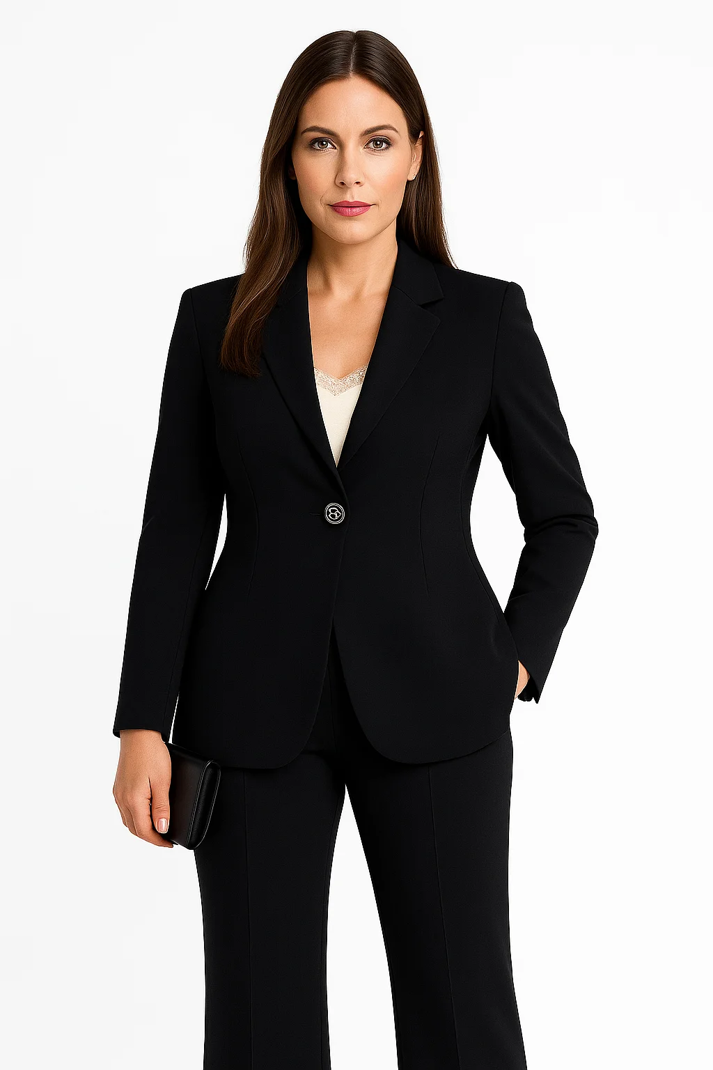 The single-breasted blazer features sharp lapels, sculpted shoulders, and a statement button that defines the waist with structure and poise. Its impeccable tailoring elongates the frame, creating a sleek, powerful silhouette. Paired with perfectly cut straight-leg trousers, the Arielle delivers balance, elegance, and control — from boardroom to evening affair.