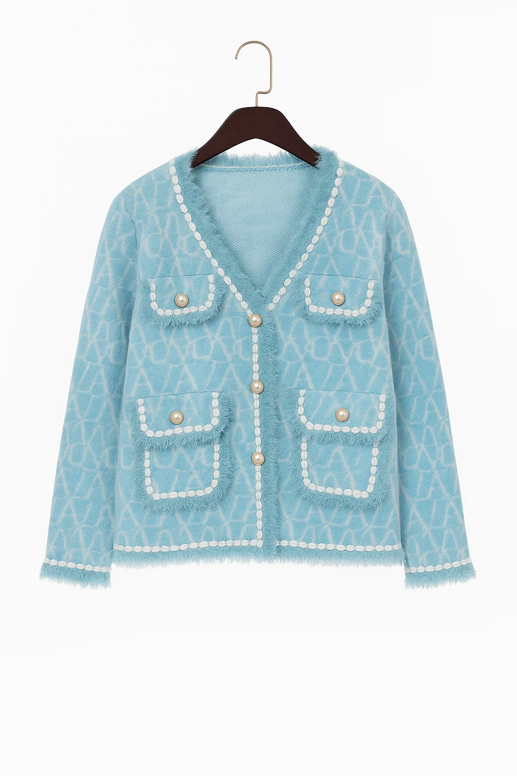 The Colette features a flattering round neckline and an elegant button-down front adorned with pearl-inspired buttons. Intricate gold-thread decorative trim frames the neckline, placket, pockets, and cuffs, adding a couture touch to its refined silhouette. Perfectly structured yet soft in feel, this cardigan transitions seamlessly from polished daytime looks to elevated evening styling.