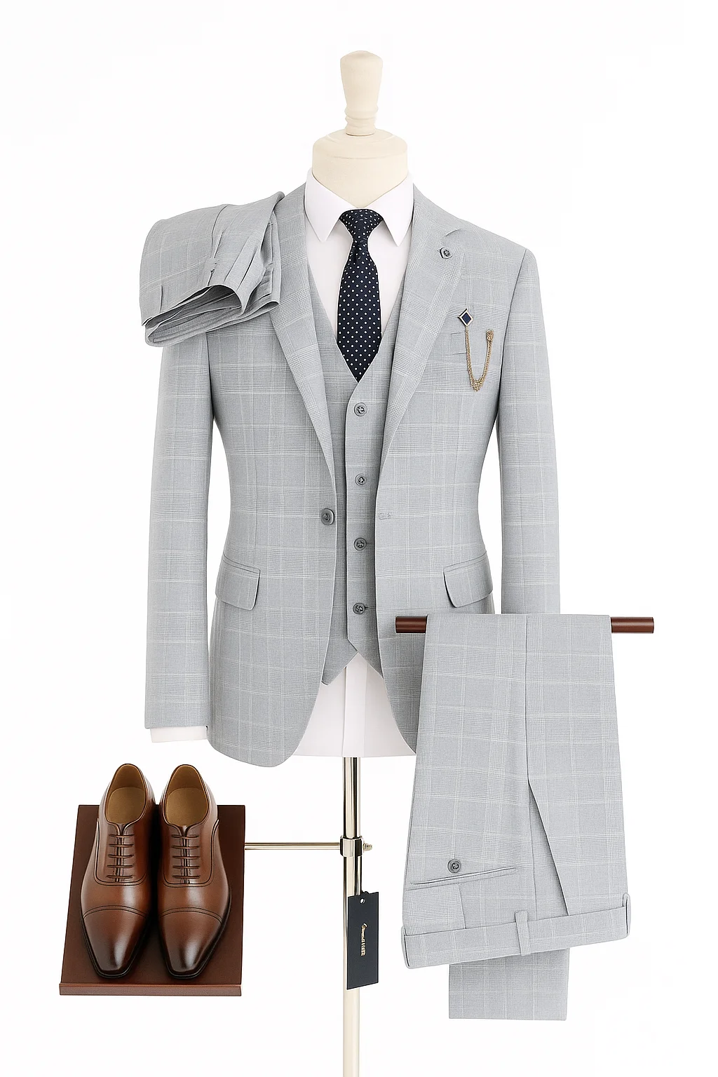 The addition of polished brown oxford shoes and a dotted navy tie completes a look of confident sophistication — ideal for those who appreciate detail, precision, and presence.