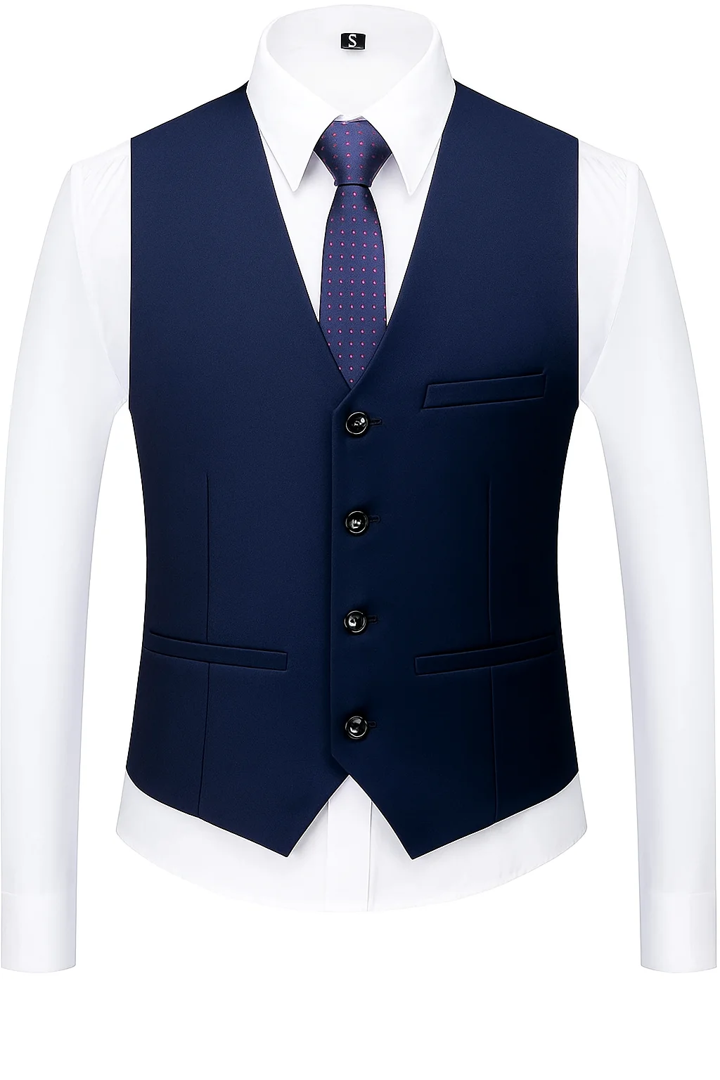 The single-breasted blazer features sharp lapels, a neatly tapered waist, and classic flap pockets that accentuate form and finesse. The matching waistcoat adds depth and dimension to your ensemble, while the flat-front trousers offer a tailored fit that balances comfort with style. Completed with a crisp white shirt and navy tie, this ensemble exudes understated confidence — ideal for weddings, corporate events, or any moment that demands refined excellence.