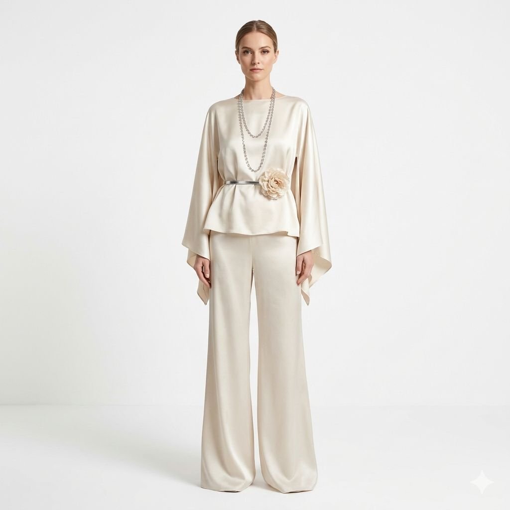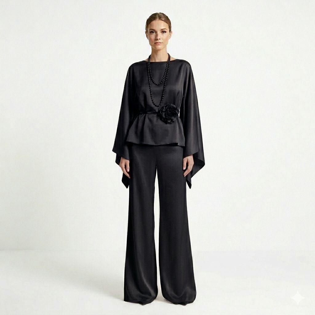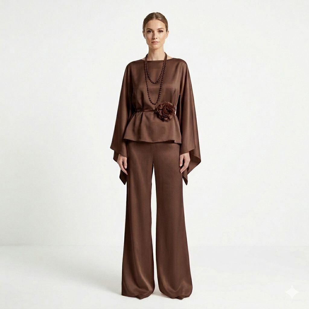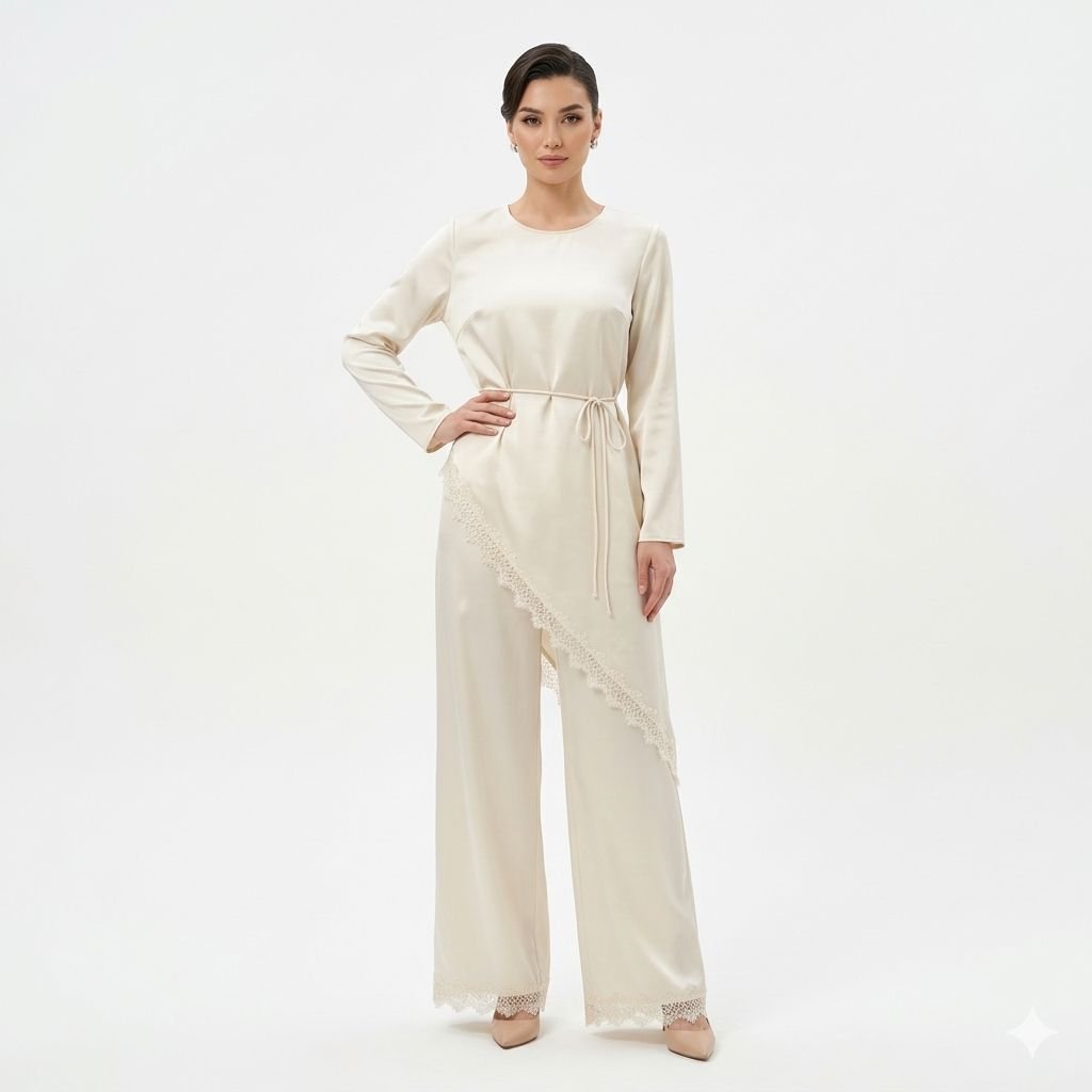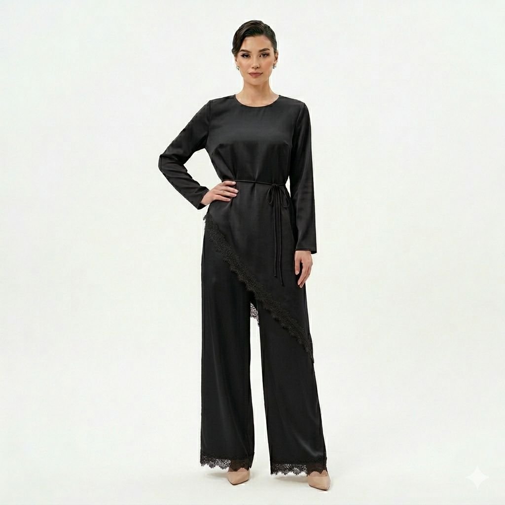 Effortlessly elegant and modest, this Silk set is the perfect fusion of refined sophistication and contemporary style. Crafted from a smooth, lustrous silk fabric in different colour tone, this ensemble features a relaxed long-sleeve top with a clean round neckline and a delicate self-tie drawstring waist that cinches elegantly without compromising comfort. The standout detail is the asymmetric lace-trimmed overlay panel that cascades diagonally across the wide-leg pants, adding a touch of feminine grace and creating a beautifully finished, sophisticated look.