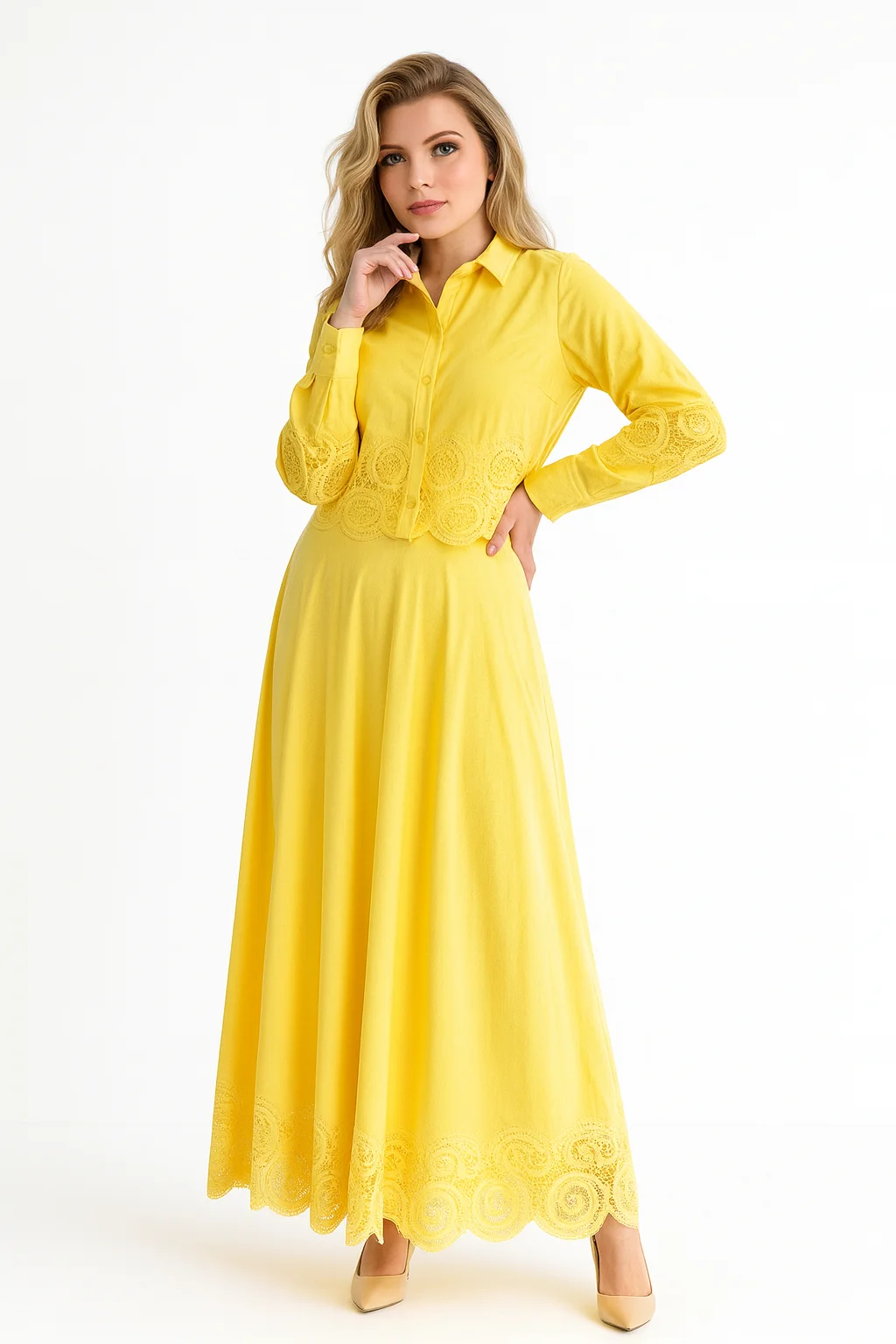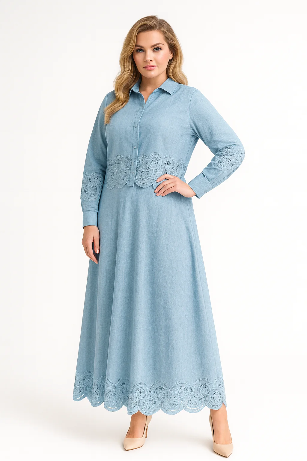 Intricate lace embroidery on cuffs, waist, and hemline
