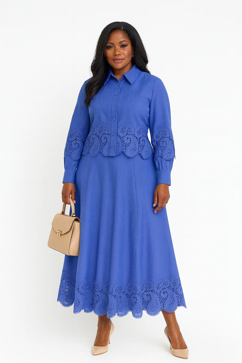 Graceful elegance meets timeless sophistication in the Elora Two-Piece. Designed for the modern woman who values quiet confidence and refined beauty, this ensemble blends classic tailoring with intricate craftsmanship. The crop-top style blouse features a button-down front for structure and poise, while delicately embroidered lace detailing along the cuffs, waist, and skirt hemline adds a touch of romantic artistry.